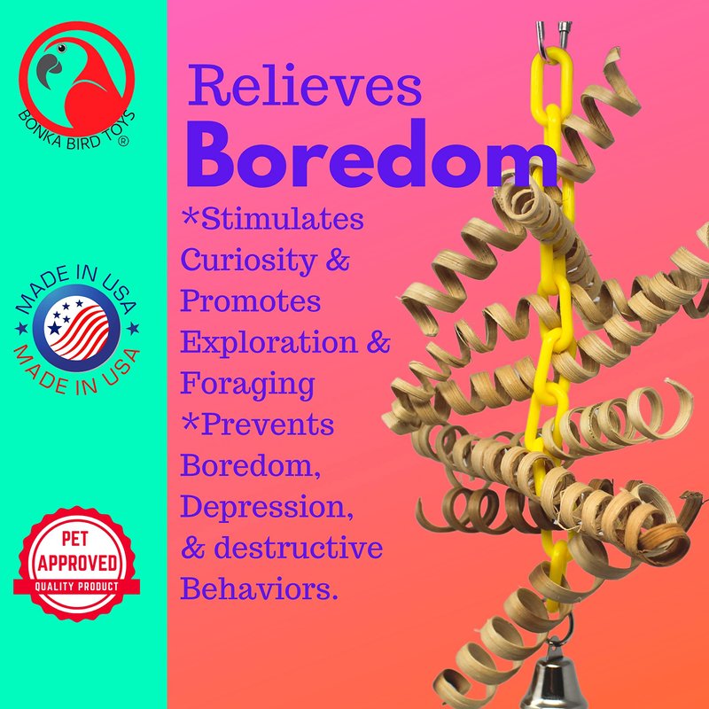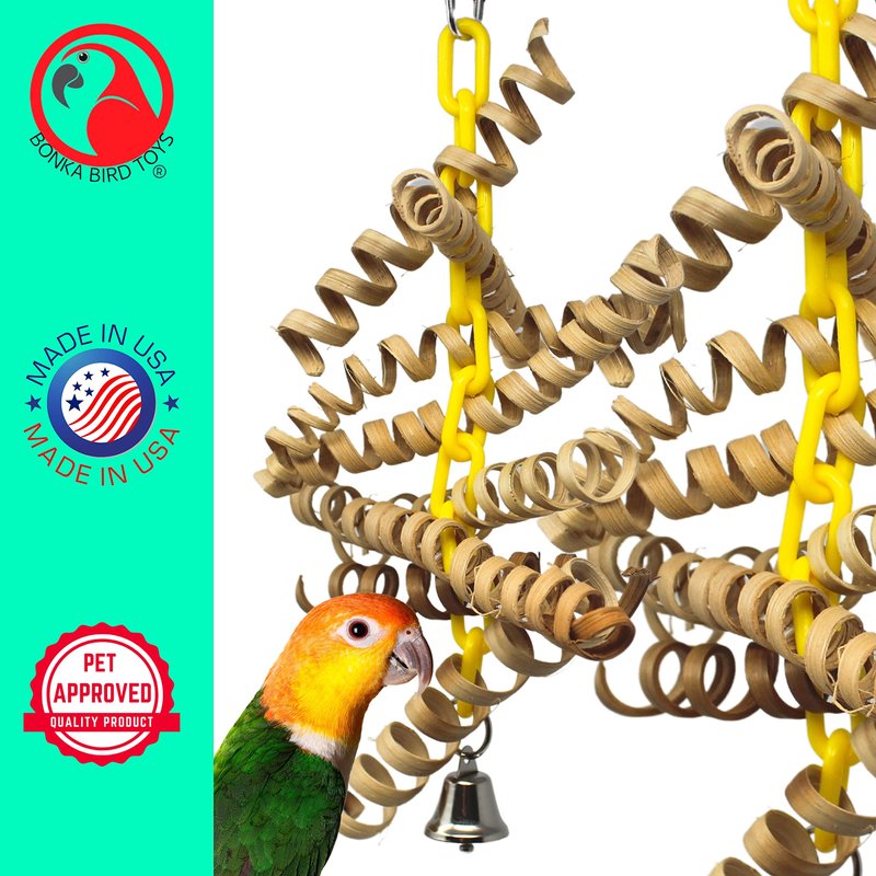 The 3449 Bamboo Spring from Bonka Bird Toys is a bouncy good time for your friendly chickies! The flexible shape of the 3449 makes it easy to install it in any cage. The quick link attachment at the top of the toy makes for fast and easy installation. The link loops through a colorful plastic chain that continues down through the center of the entire toy. This chain ends in a metal loop with a metal bell hanging. There are numerous bamboo springs strung through the plastic chain. These springs are perfect opportunities for your pet to pull and chew as they spring back to shape and move the toy all over the place. The 3449 Bamboo Spring from Bonka Bird Toys is 100% bird safe and weighs and measures approximately: Length: (11) inches Width: (7) inch Depth: (2) inch Weight: Under (4) ounces Cute springy bird toy. Full of fun bamboo springs. Easy to pull and chew. A refillable chew puzzle of a toy. All-natural Bamboo coil springs. 100% bird-safe materials. Quick link for easy cage placement.