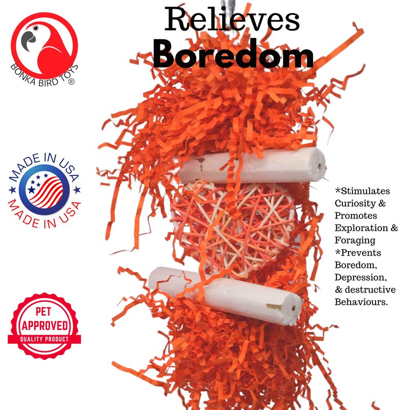 The 3885 Heart Log from Bonka Bird Toys is an excellent chew, forage, and shred fest for your medium to large-sized, cherished companions, a great toy to hide treats for birds with active minds and busy beaks. It features a hand-woven vine heart with two natural Sola Atta logs surrounded with foraging crinkly paper, providing your bird with an outlet for its destructive impulses. There are multiple options for hiding treats and other goodies inside or around the toy; besides all the chew textures, a unique, natural, colored toy is sure to entice and satisfy their curiosity. This hanging, fun-filled trinket will alleviate cage boredom and enrich their cage surroundings. The refillable and reusable toy is 100% bird-safe, giving you peace of mind regarding playtime. The 3885 Heart Log from Bonka Bird Toys measures approximately ten (10) inches high by five (5) inches wide, weighs around 1 ounce, and comes complete with a quick link for easy placement in or out of the cage. Available in five beak and feather-attracting colors for your Conures, African Greys, Cockatiels, and similar birds.