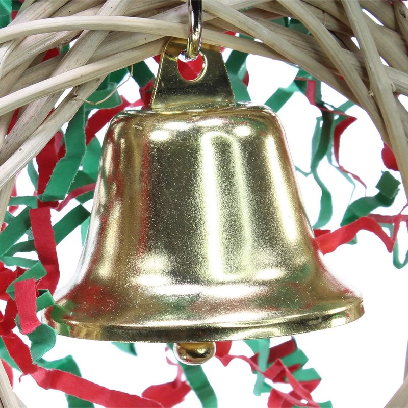 The 9004 Christmas Ring from Bonka Bird Toys! A true holiday favorite for your small feathered friend, a vine wreath is adorned with festive crinkly paper and a golden bell for true foraging fun. The perfect toy to decorate the cage with, it measures approximately 7 1/2 inches high by 4 1/2 inches wide and comes complete with a quick link for easy cage placement.