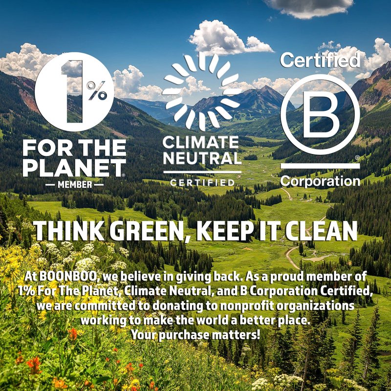 - Think Green, Keep it Clean: At BOONBOO we believe in giving back. As a proud member of 1% for the Planet, Climate Neutral Certified, and B Corporation Certified, we are committed to donating to nonprofit organizations working to make the world a better place. Your purchase matters!