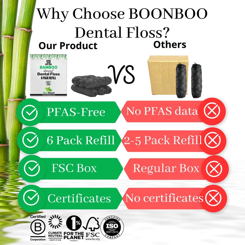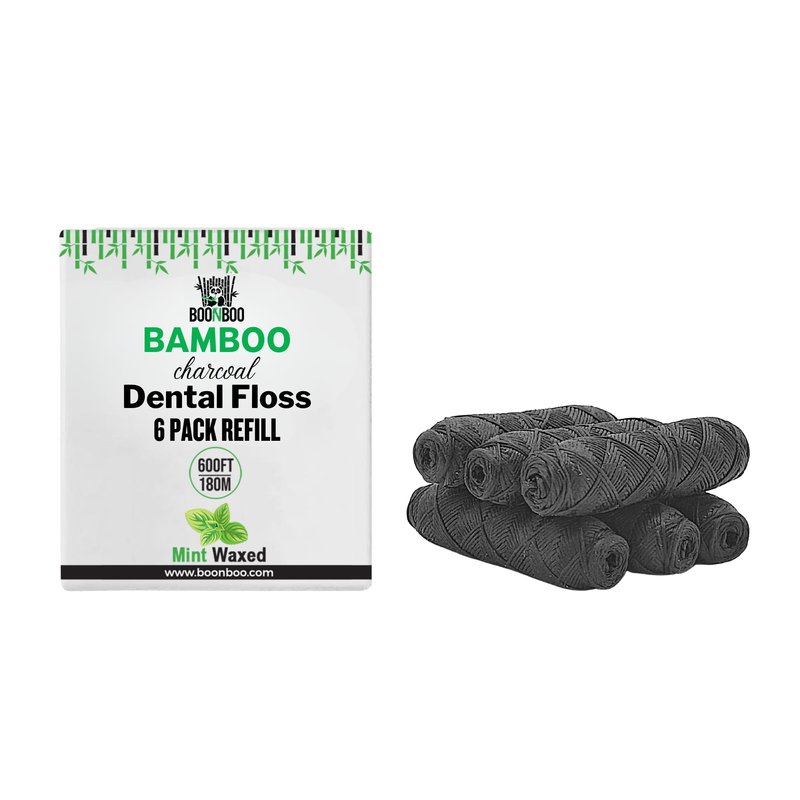 BOONBOO charcoal dental floss has been specifically created with health in mind. This dental floss is made with bamboo charcoal woven thread, candililla wax, and peppermint essential. Natural dental floss is slightly thicker which helps clean between your teeth and braces. It fits most dental floss holders, and is a great product if you care about your dental health. It is recommended that you floss your teeth at least once a day as black charcoal dental floss is very effective at removing food from between your teeth and braces. This 6 pack dental floss refills are for your already purchased glass bottle with cutting lid.