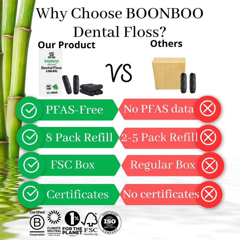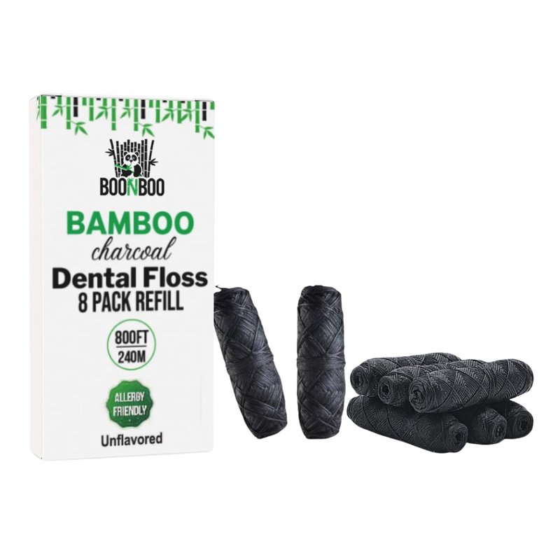 BOONBOO dental floss is made with bamboo woven thread, candililla wax, and is unflavored. Boonboo dental floss is slightly thicker which helps clean between your teeth. It is a great product if you care about your dental health. It is recommended that you floss your teeth at least once a day as dental floss is very effective at removing food from between your teeth. This 8 pack dental floss refills are for your already purchased glass bottle with cutting lid.