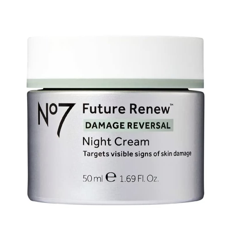 No7 Future Renew Damage Reversal Night Cream reverses visible signs of skin damage while you sleep***. This peptide night cream is formulated with Pepticology, No7's new and patent-pending peptide technology. Pepticology is exclusive to No7's Future Renew line. This technology supports the skin's natural self-repair process and reverses the visible signs of skin damage, such as the appearance of uneven tone and texture, dry skin, and feeling of lost elasticity***. This skin repair night cream is designed to be used with the rest of the No7 Future Renew range. Apply every evening. Massage in small upward circles over your face and neck. No7 is the U.K.'s best-kept beauty secret with over 85 years of trusted expertise - exceptional beauty shouldn't be a luxury. With No7 Future Renew Night Cream, skin feels moisturized for 72 hours**; 96% of women said they experienced a reversal in the feeling of skin dryness From the first use, skin feels nourished, softer and smoother* After 1 week of use, skin feels supple, and skin texture looks more even*; 93% of women said their skin looked healthier This indulgent night face cream has a lightweight texture that absorbs quickly into skin without leaving a sticky residue This formulation is dermatologist approved and suitable for sensitive skin