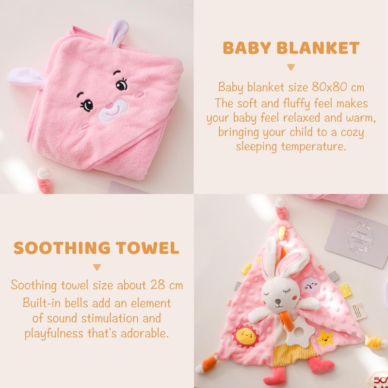 • 【Enteraining Blanket & Rattle】The bunny rattle and elephant blanket are exquisite toys that provide entertainment and stimulate a baby's auditory and visual senses. The rattle can help the baby learn to grasp and shake, enhancing hand-eye coordination. These are fun interactive tools that parents and babies can play with together.