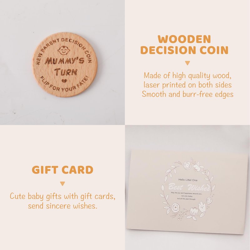 • 【Baby Gifts Basket Essentials】 – Everything comes in a cute square gift box. Items include Onesie, Swaddle Blanket, Rattle, Baby Lovey, Socks, Gift Card, Funny Decision Coin, Baby Milestone