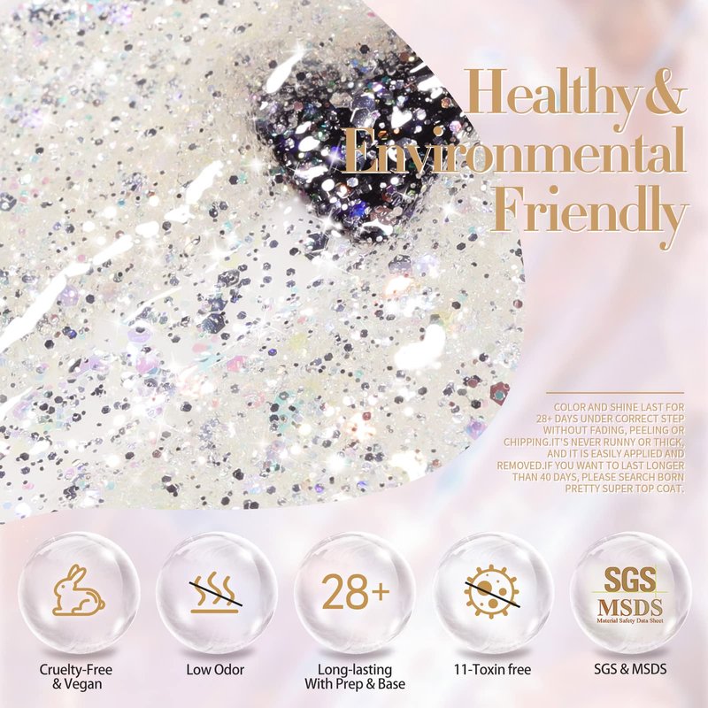 - PACKAGE CONTENTS:6 Bottles 7ml glitter gel polish.This super pigmented set with heavy glitter gel is a must have for every nail tech and DIY user!A full set of sparkly glitters to mix and match for any energetic spirit! Get your beauty manicure set on with the Shiny nail polish gel.