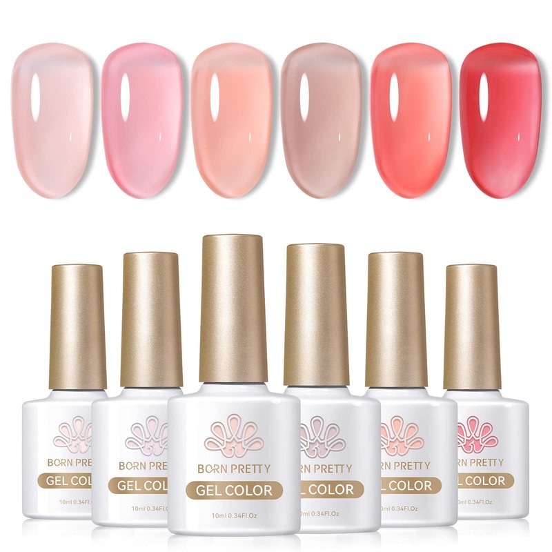 - PACKAGE CONTENTS:6 Bottles BORN PRETTY 10ml jelly nude pink gel nail polish set.Inspired by MOST POPULAR GEL COLOR. You'll be dizzy with delight wearing this jelly-candy-pink gel nail polish.Jelly gel polish will make your nails like a cherry blossom jelly, it is a semitransparent nail gel. One layer, two layers and three layers are different effect.