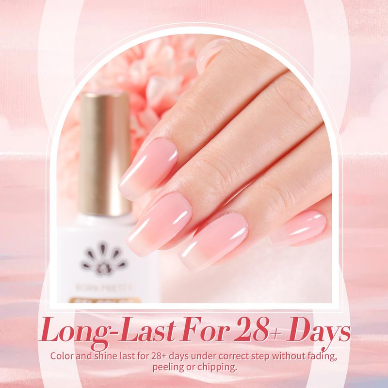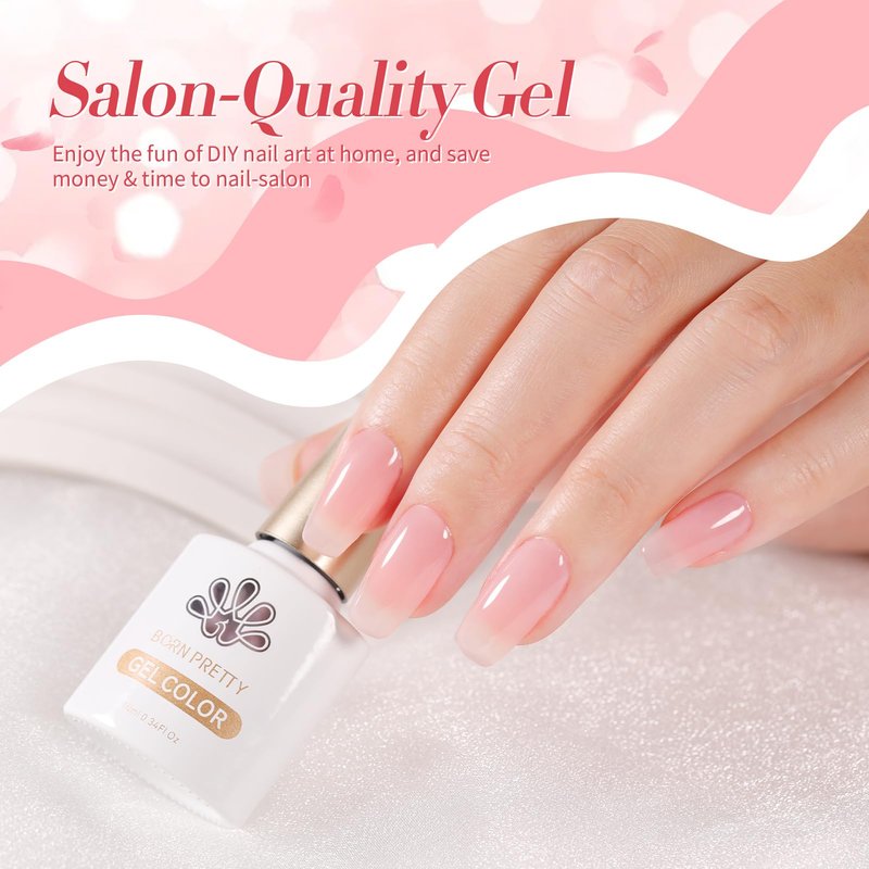 - 6 Bottles BORN PRETTY 10ml jelly pink gel nail polish set.Inspired by MOST POPULAR GEL COLOR. You'll be dizzy with delight wearing this jelly-candy-pink gel nail polish.Jelly gel polish will make your nails like a cherry blossom jelly, it is a semitransparent nail gel. One layer, two layers and three layers are different effect.