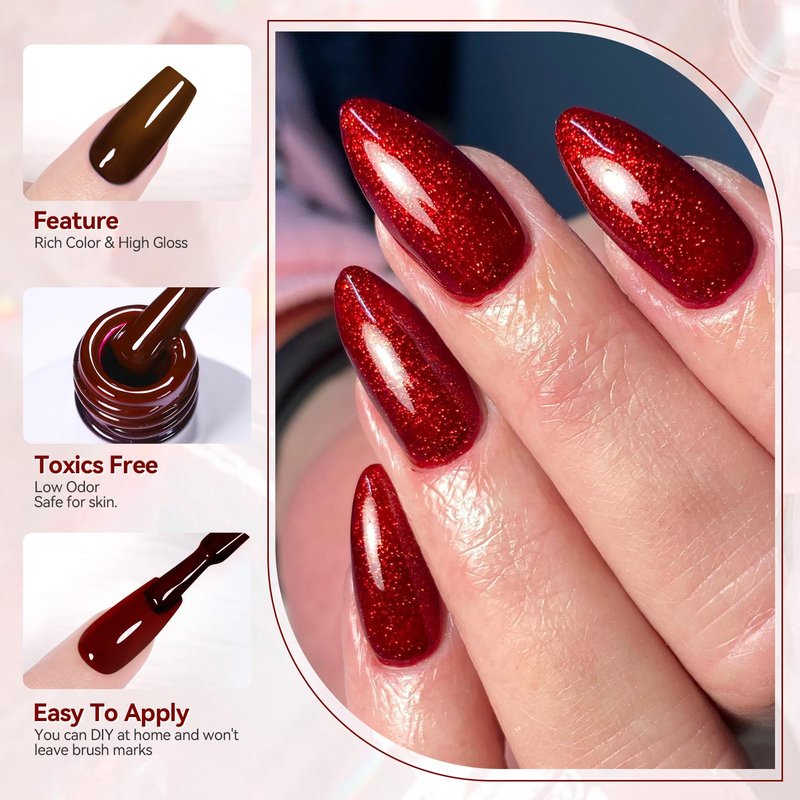 - Package Contents: 6 Colors 7ml Red Gel Nail Polish. We have put together the top 6 trendiest colors of red! We studied the upcoming color trends closely so you can display a colorful, stylish, modern manicure every time for the holiday! Just enjoy the latest nail fashion and showcase your artwork, especially for nail designs.