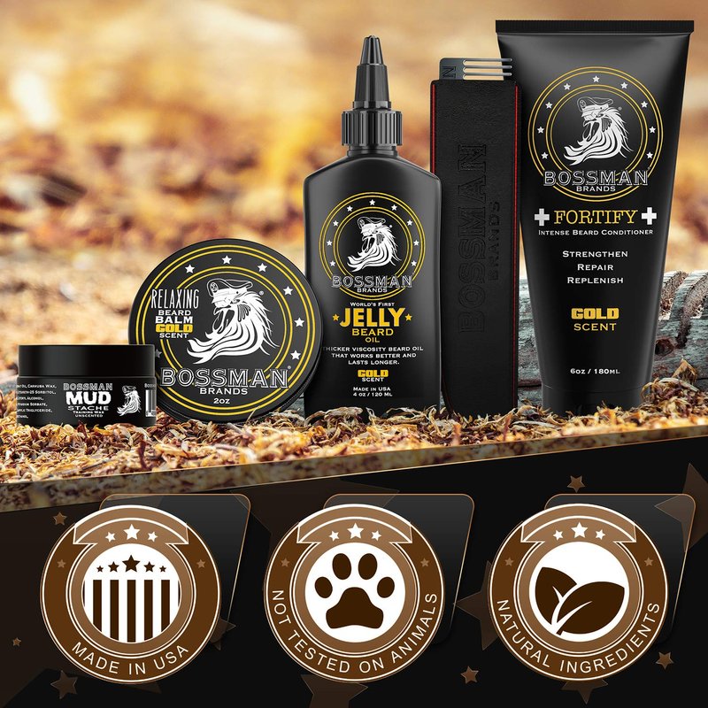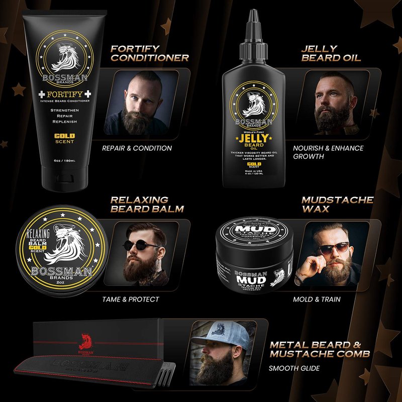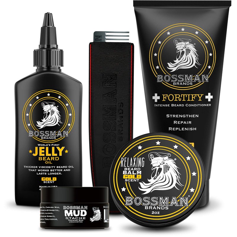 - Your Complete Beard Grooming Kit: Introducing the Bossman Complete Kit. This mens grooming kit features everything you need to maintain your beard, no matter your style. Includes the Fortify Intense Beard Conditioner, Jelly Beard Oil, Relaxing Beard Balm, MUDstache Training Wax, and a Metal Beard Comb. Comes in six scent options so you can smell like a man's man. Makes the perfect gift for all beard aficionados
