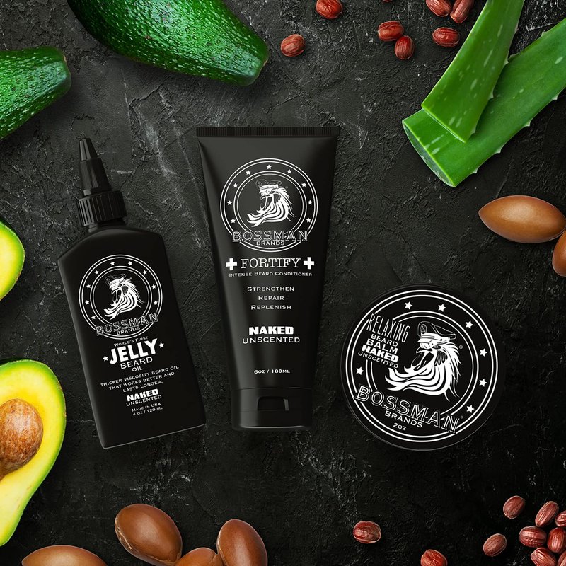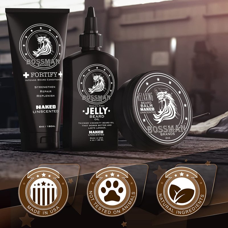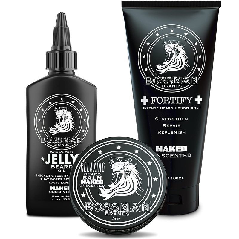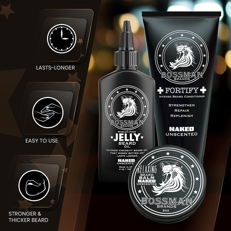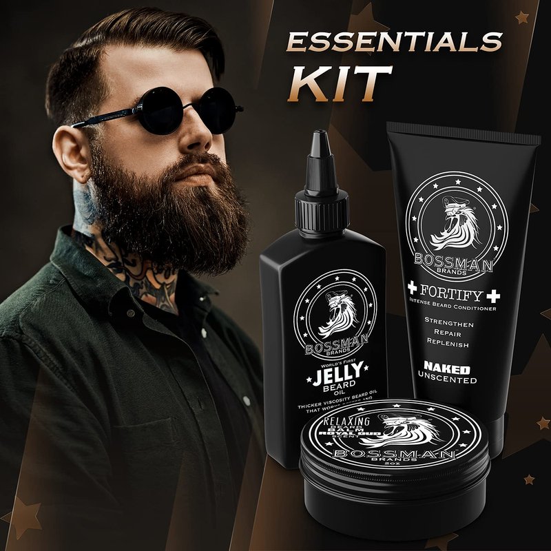 - Your 3-Piece Essentials Beard Treatment Package: Our beard care kit includes the Fortify Intense Beard Conditioner, Jelly Beard Oil and Relaxing Beard Balm. The combo of these three Bossman beard products is designed to moisturize hair and skin, promote strength and growth, and train unruly beards. It also makes a fantastic gift set for the bearded bosses in your life.