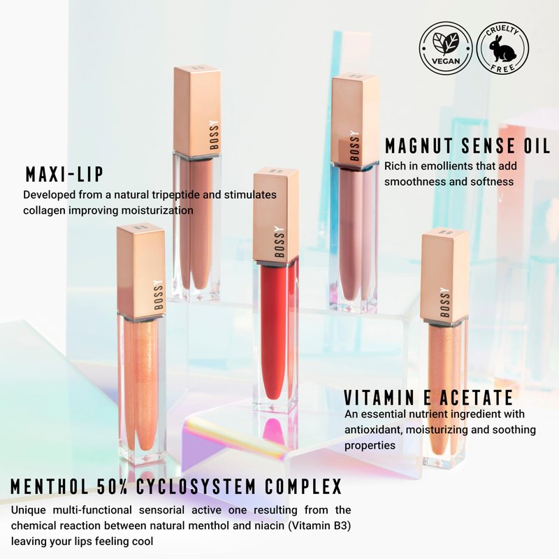 - MOISTURIZER: Our Bossy lip gloss consists of a sheer, lightweight, non-stick texture, and is enriched with ingredients that will leave your lips looking and feeling naturally enhanced. The gloss is made up of Maxi Lip, a compound known for its volumizing and moisturizing effect, as well as MagNut Sense Oil and Vitamin E which leave lips feeling soft and smooth.