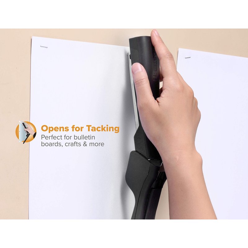 - Built-in pencil sharpener, staple remover, and hidden staple storage