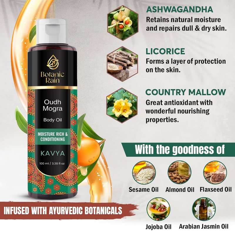 Botanic Rain Ayurveda Body Oil With Oudh & Mogra, Organic Body Oil After Shower, Moisturizing & Hydrating Natural Body Oils For Women And Men, 3.38 Fl Oz