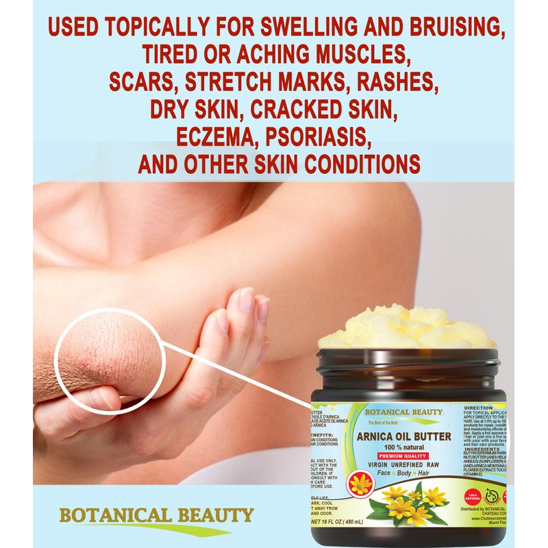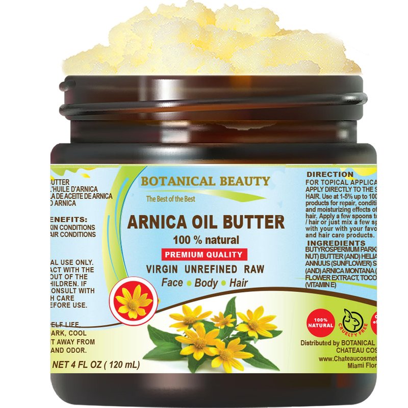 - Botanical Beauty ARNICA OIL BUTTER Arnica Montana Oil infusion in Shea Butter ( Butyrospermum Parkii) is 100% Natural RAW. A Little Goes a Long Way, Absorbs Quickly, Not Greasy, Not tested on Animals, Does not contain any preservatives.