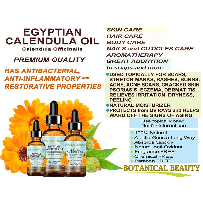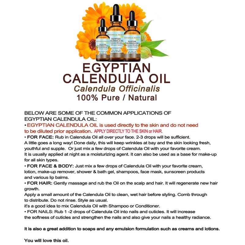 - CALENDULA OIL Calendula Officinalis EGYPTIAN is 100% Pure with no additives. A Little Goes a Long Way, Absorbs Quickly, Not Greasy, Not tested on Animals, Does not contain any preservatives.