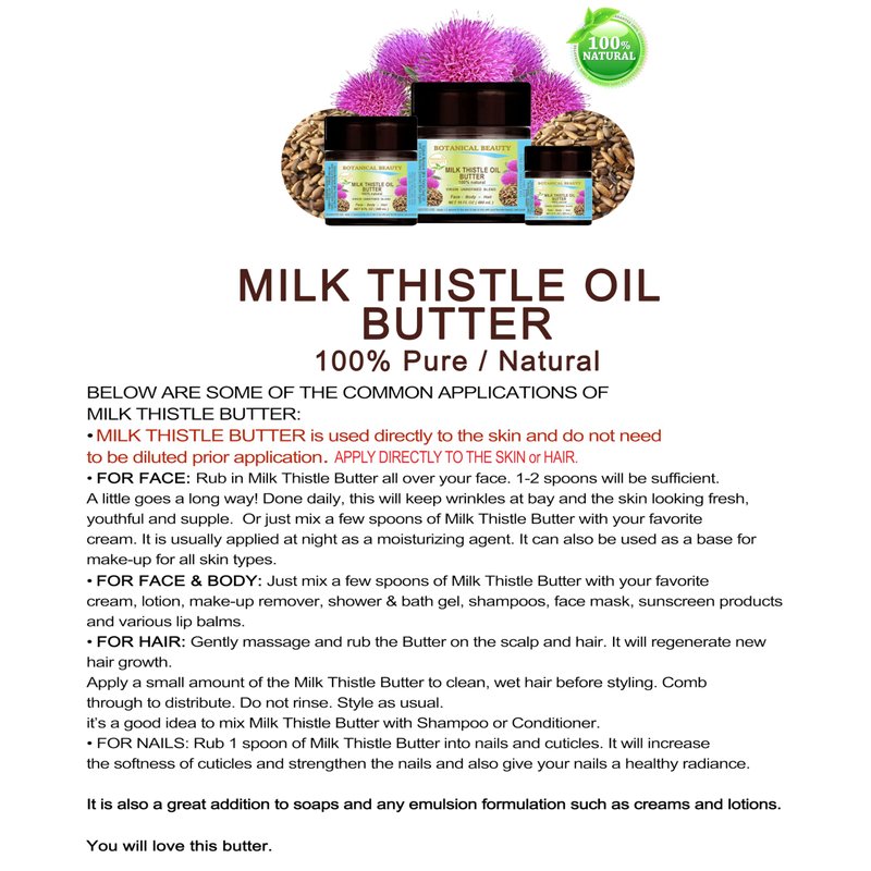 - MILK THISTLE SEED OIL BUTTER RAW absorbs easily into the skin. It is a functional addition after sun care products. Hydrating, Moisturizing, Nourishing, Rejuvenating, Smoothening, Softening, Soothing, Anti-aging, Anti-wrinkle, Brightening. Great additional for soap, creams, lotions, body butter, and more. It is a great massage butter. MILK THISTLE SEED OIL BUTTER Silybum marianum is used on face, skin, hair, scalp, lip, nails care and foot care.