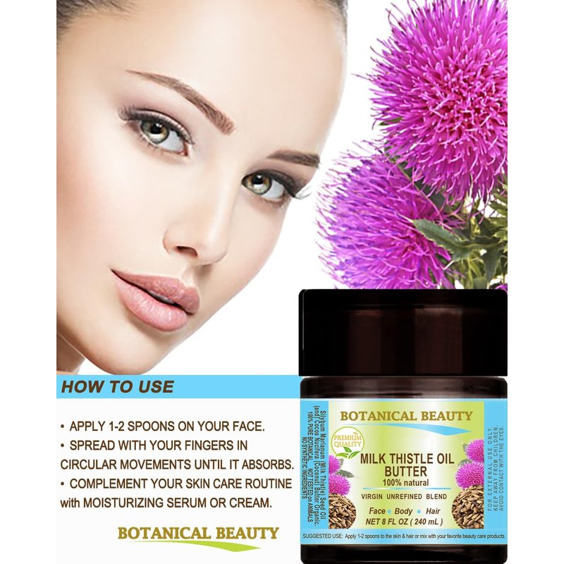 - Botanical Beauty MILK THISTLE SEED OIL BUTTER Silybum marianum is 100% Pure Botanical RAW 100% Natural with no additives. Milk Thistle, also known by many other names such as Marian thistle and Scotch thistle. Used for thousands of years for its moisturizer properties, Milk Thistle is great for the body and skin. MILK THISTLE OIL BUTTER is so rich with Silymarin skin-enriching vitamin E, vitamin B complex and linoleic fatty acids.