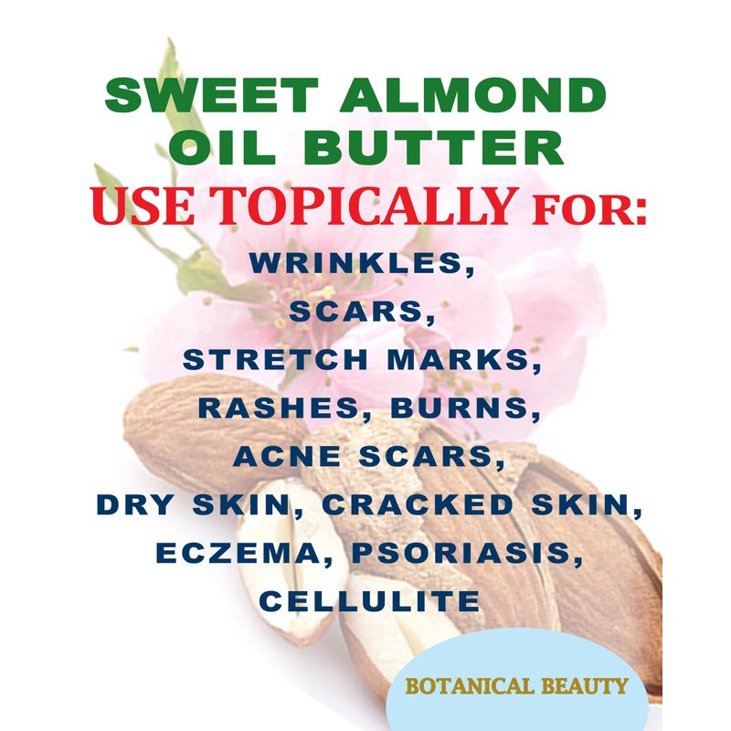 - Botanical Beauty SWEET ALMOND OIL BUTTER absorbs easily into the skin. It is a functional addition after sun care products. Hydrating, Moisturizing, Nourishing, Rejuvenating, Smoothening, Softening, Soothing, Anti-aging, Anti-wrinkle, Brightening. Great addition for soap, creams, lotions, body butter, and more. It is a great massage butter.