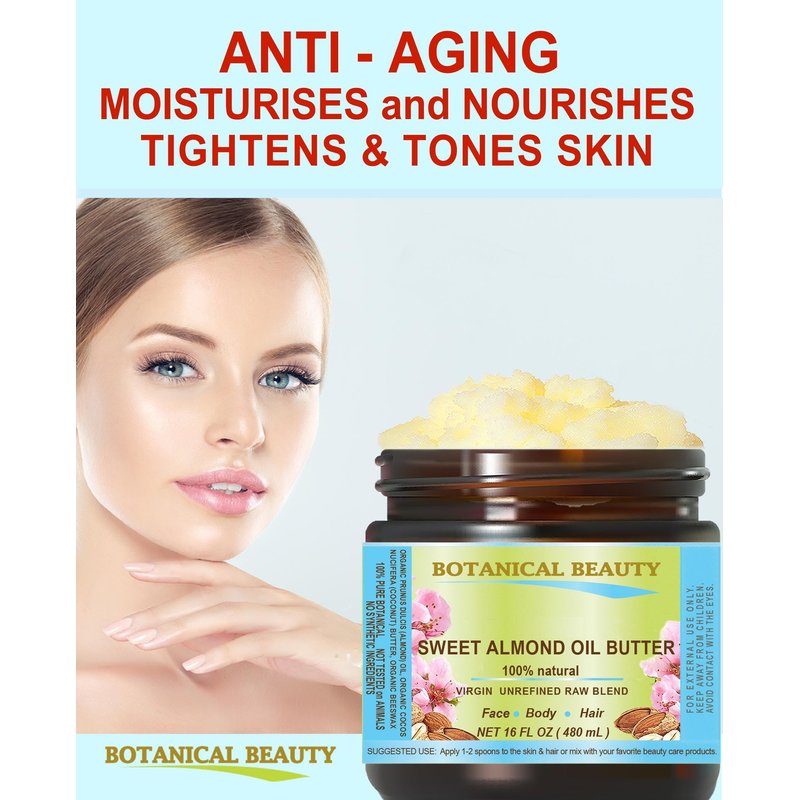 Botanical Beauty SWEET ALMOND OIL BUTTER Pure Natural Virgin Unrefined RAW 16 Fl. Oz.- 480 ml for FACE, SKIN, BODY, DAMAGED HAIR, NAILS.