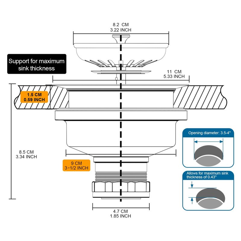 - 3-1/2 INCH KITCHEN SINK DRAIN: Fits for all standard American sink drain with 3.5 inch drain hole (Supports up to 0.59'' sink thickness). This kitchen sink drain assembly combines solid construction with ease of use