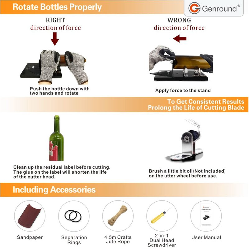 - 【Reinforced Support Panel for More Stable Cut】 We've upgraded Genround 2.1 bottle cutter with reinforced panel, providing a more stable support for glass cutting. It's difficult to bend or shake when you press the bottle against it, making it easy to score a complete circle and create a clean cut.