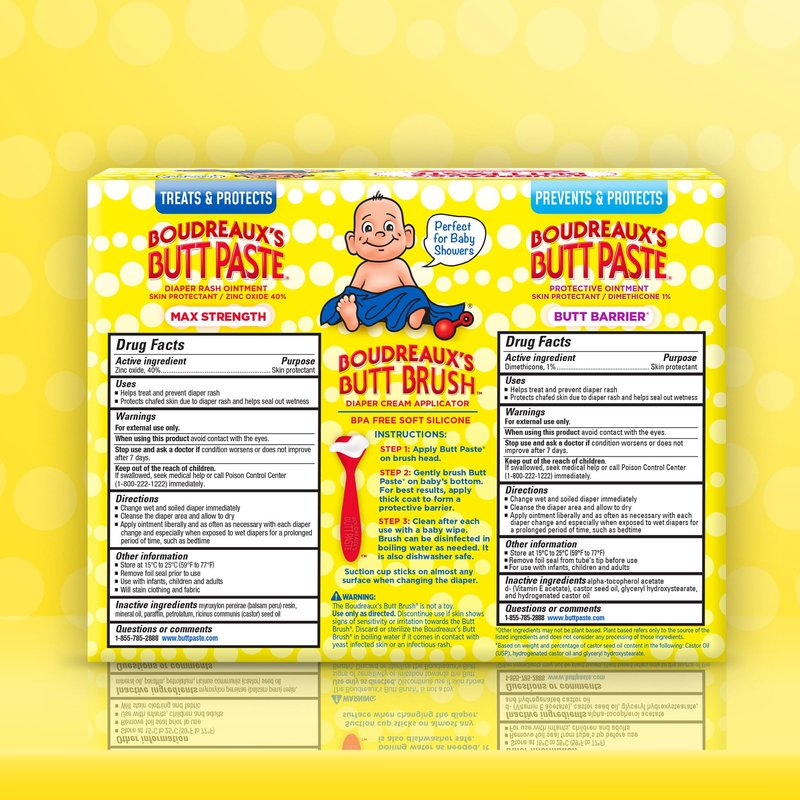 - This new baby gift set includes Maximum Strength Diaper Rash Cream, Ointment in a 14 oz jar for the nursery and a 2 oz tube for your diaper bag, Butt Barrier in a 4 oz tube, and 1 silicone brush diaper cream applicator