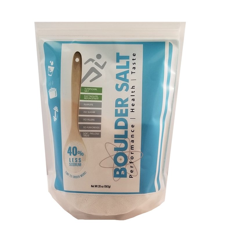 Healthy Salt - Electrolyte Salts for Food or Water. Boulder Salt is a special blend of salts that tastes great (with 40% less sodium). It has the benefit of giving access to a great tasting salt for those on a low sodium diet. Boulder salt is truly a healthy salt. In water, the salts are alkaline, which helps sooth the stomach. On food, it tastes great and is a healthy alternative to regular table salt (sodium chloride). High magnesium provides the benefit of cramp relief/restless leg syndrome. Convenient to use: on food or in water. Purity: additive-free, sugar-free. Made in Colorado USA