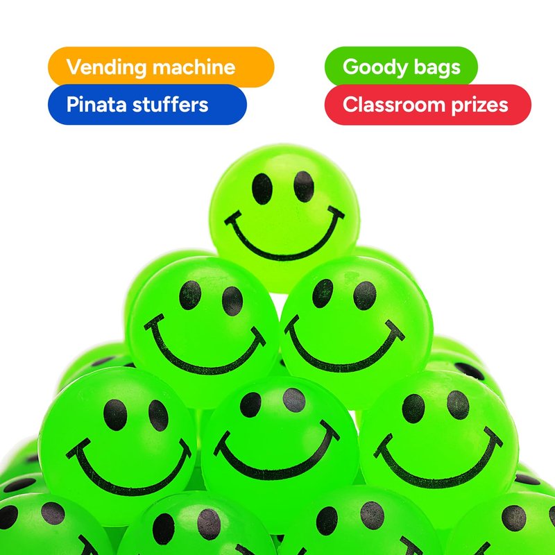 - High Bounce; Cool Glow: Delightful smiley face designs and the coolest glow effect make these 1” bouncy balls a hit. Activate the glow by leaving them under light, then watch them light up the room with every bounce.