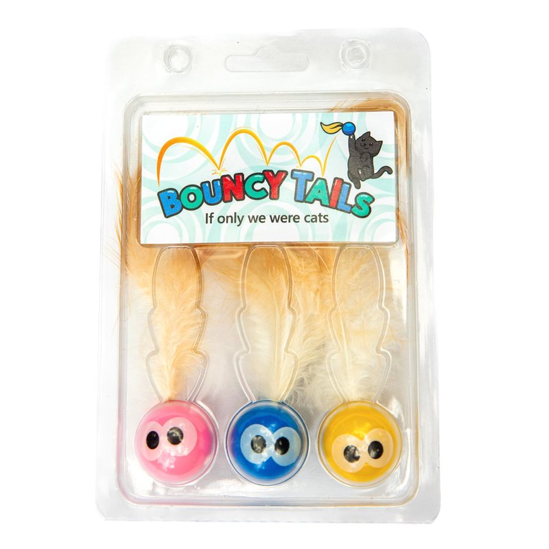 Bouncy Tails 3 Pack Interactive Bouncy Ball with Natural Feathers for Indoor Cats and Kittens who Love to Play and Have Fun.