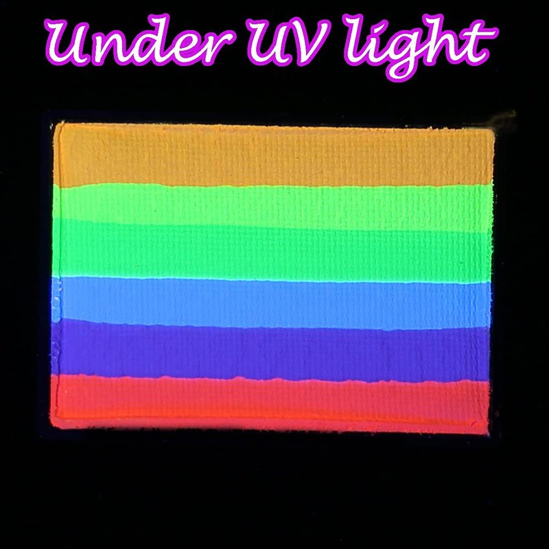 - Bowitzki Water Activated Split Cake Liner makeup is *NOT A GEL LINER + NOT WATERPROOF* combines 6 UV Colors - Peachy, Lilac,Sky Blue,Mint,Lemon and Aurora, It glows under UV light. Come in 50 gram Container. perfect to use with a sponge to create easy colorful designs.You can use each color seperately, OR use them together to create awsome eyemakeup/body face painting