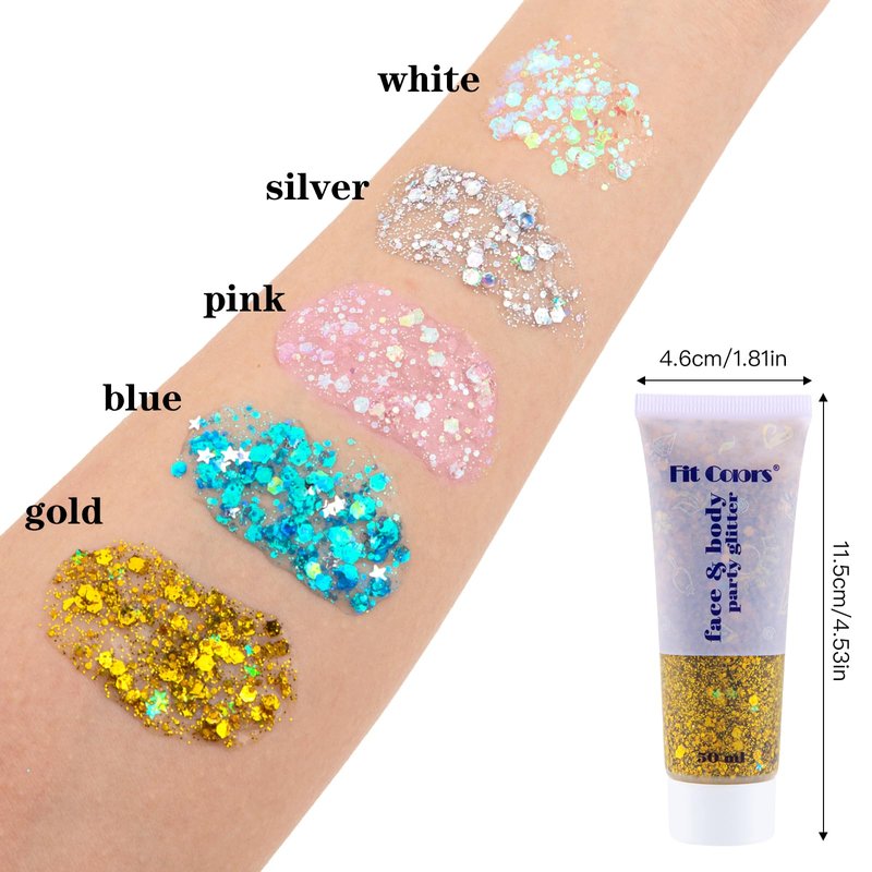 - 【Multi-color face glitter】Our body glitter gel contains 5 colors of face glitter, there are white glitter, pink glitter, blue glitter, gold glitter and silver glitter, you can choose your favorite color to mix to create the perfect glitter makeup look for yourself, or you can use it as a body glitter or a hair accessory to create a shimmering effect.