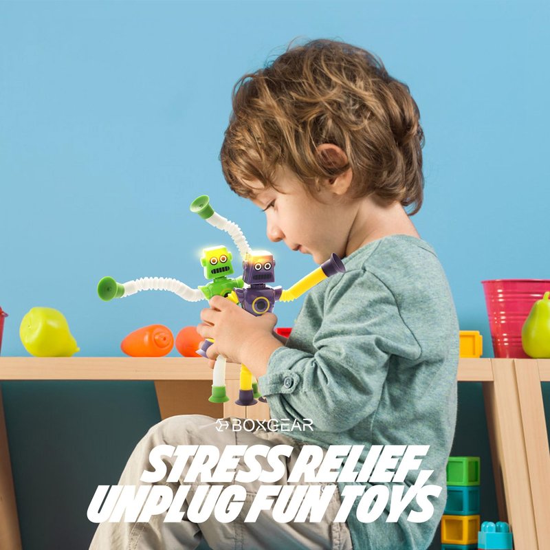- The LED robot suction fidget tubes sensory toy is also easy to clean and lightweight, making it an ideal companion for playtime on-the-go. Its bright colors and adorable shape are sure to capture children's attention and spark their creativity
