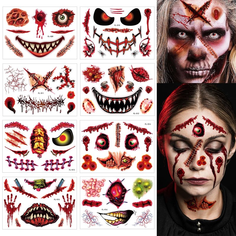 - Package Includes: You will get 8 sheets of Halloween Face Makeup Temporary tattoo stickers, use for temporary tattoos face decals prank props for Halloween cosplay party DIY decorations.