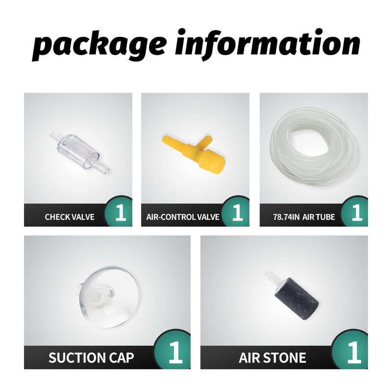 - Equipped with all accessories: Including UX-3 aquarium air pump, 200 cm air line, 1x air stone, 1x backflow valve, 1x control valve, 1x suction device, you can use the product more easily and safely