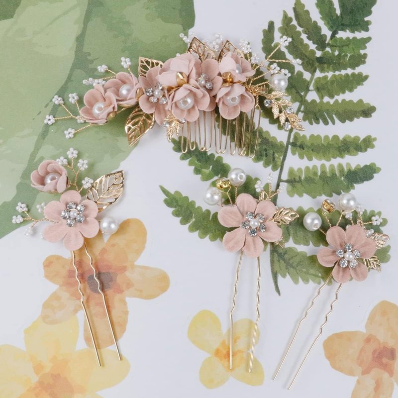 BOYIVI 4 Pieces Bridal Floral Hair Comb and Pins, Pink Alloy with Rhinestones, Plump Smooth Pearl and Fake Petal Wedding Hair Accessories for Brides, Bridesmaids, Women, Girls