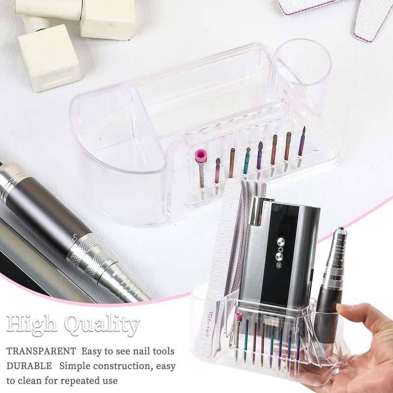 - 【Exquisite Design】This nail drill storage box is designed with 8 small holes for holding nail drill bits; The higher part is composed of 3 separate deep slots which can hold up nail drill, nail files as well as other nail must haves.