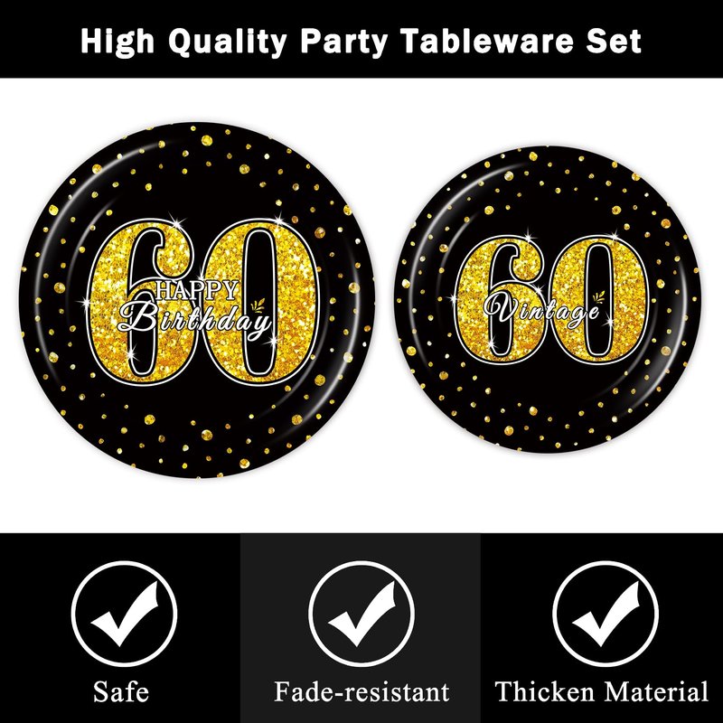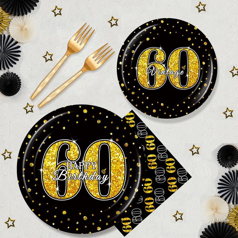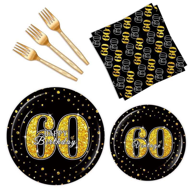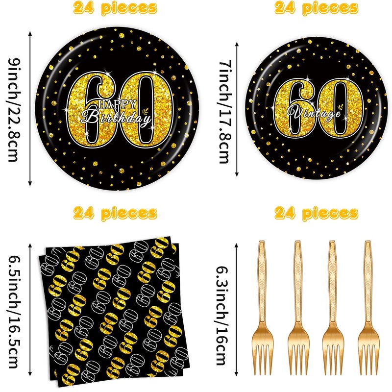 - Package Includes: You will receive 24 pieces of 9-inch 60th birthday cake plates, 24 pieces of 7-inch 60th birthday dessert plates, 24 pieces of forks, and 24 pieces of 60th birthday napkins, 96 pieces of 60th birthday party decorations in total. These happy 60th birthday decorations will be sufficient to meet your needs for serving 24 guests.