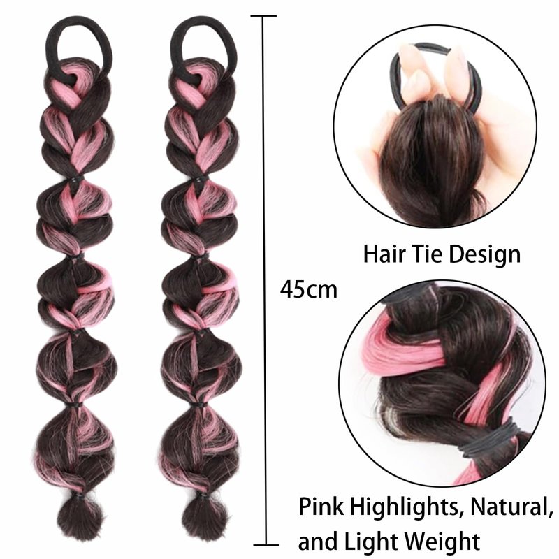 Braided Ponytail Extension with Hair Tie Pink and Black Bubble Wrap Around Pony Tail Hair Extensions 2 Pcs Natural Soft Elastic Hair Band Hairpieces Synthetic Hair Piece for Women Daily Wear