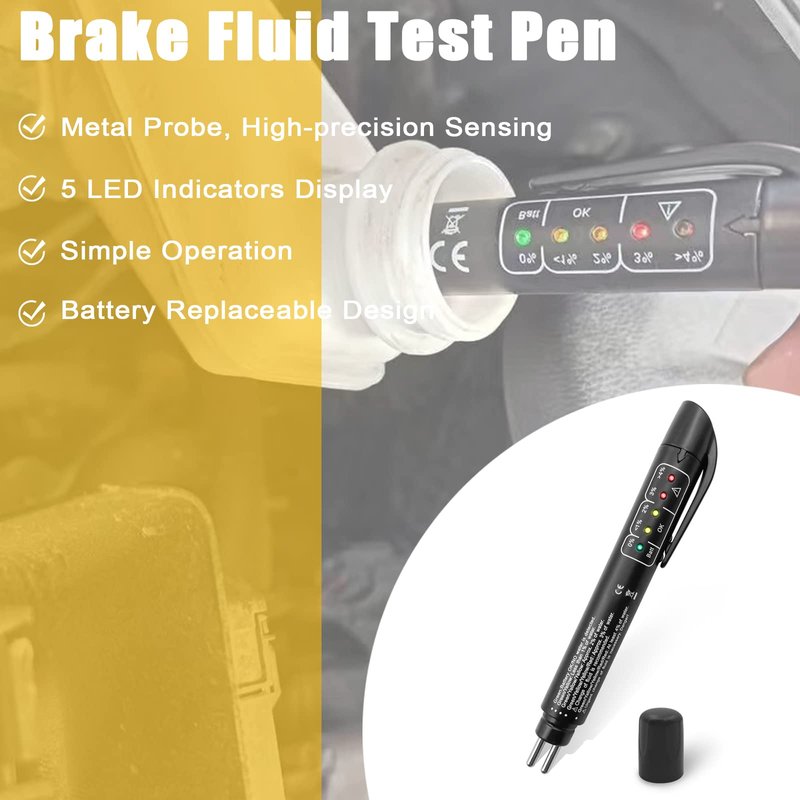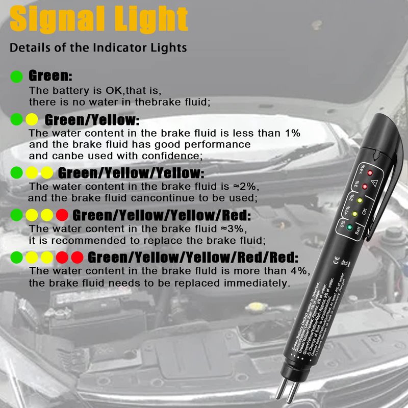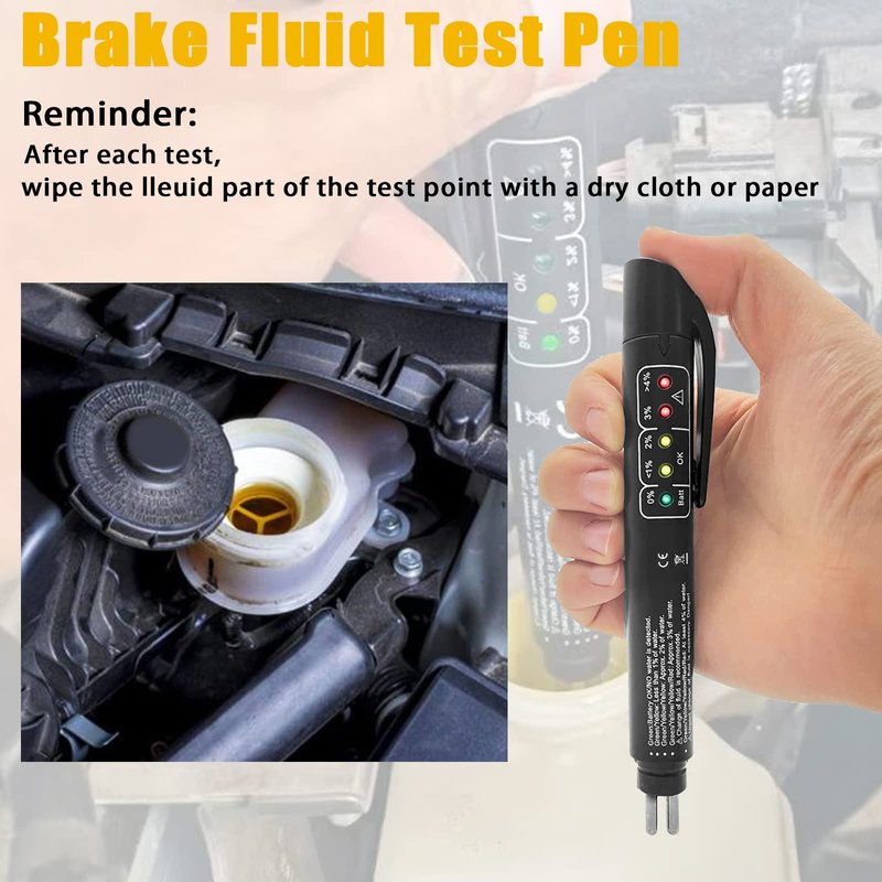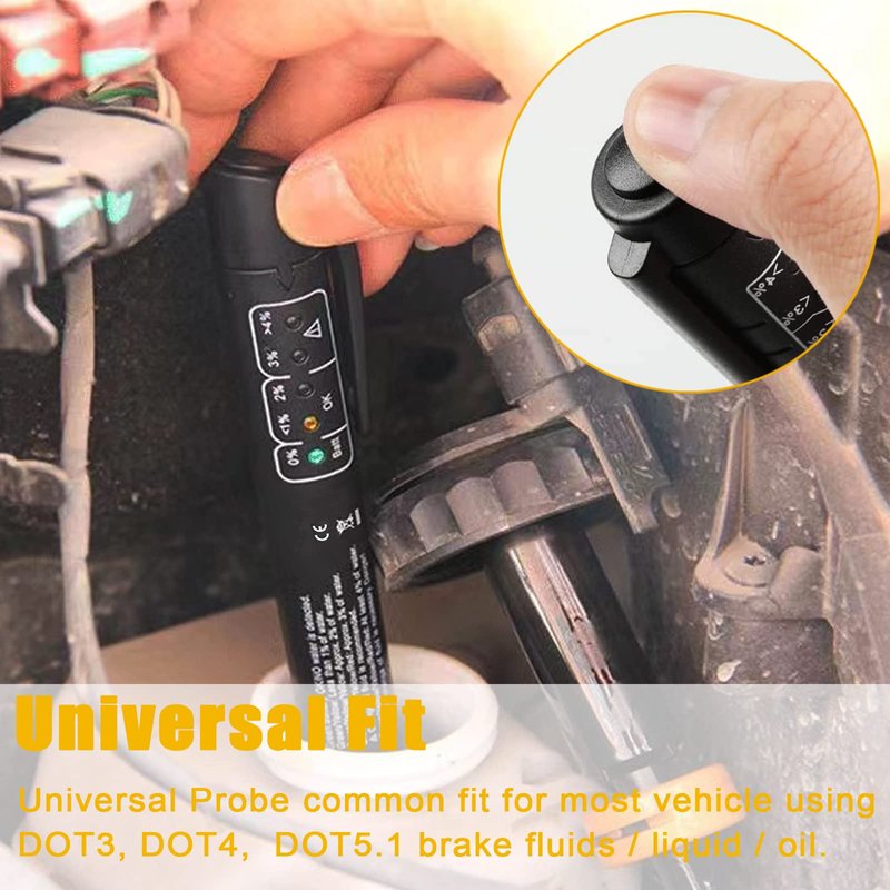 - Simple Design: 5 LED indicators show the percentage of water in the brake fluid. The brake fluid tester pen is compact and portable, provides more accurate test result, oil-proof and oxidation-proof, with good condition and high precision.