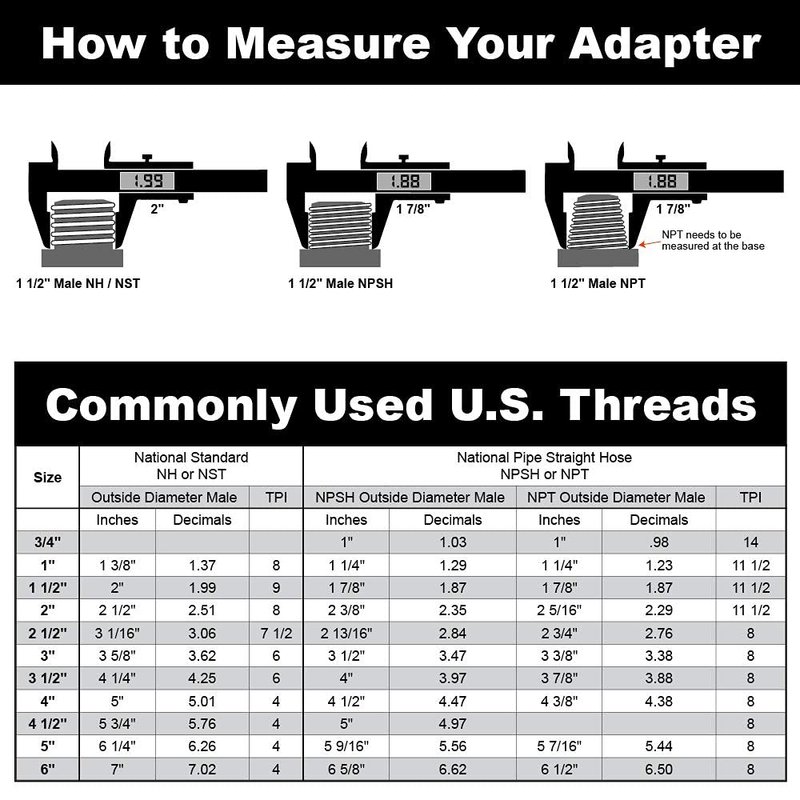 - Outside diameter of a male NH / NST adapter - 3.06 inches (7.5 Threads per inch)