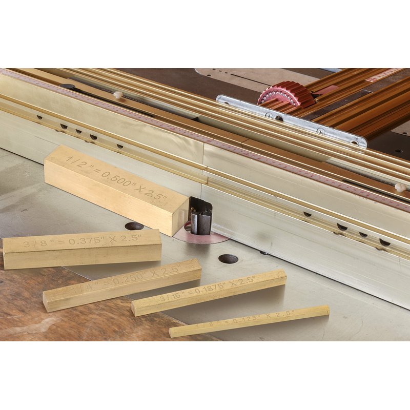 - Easily set fence and cutter height with this beautiful set of five solid brass setup gauge blocks