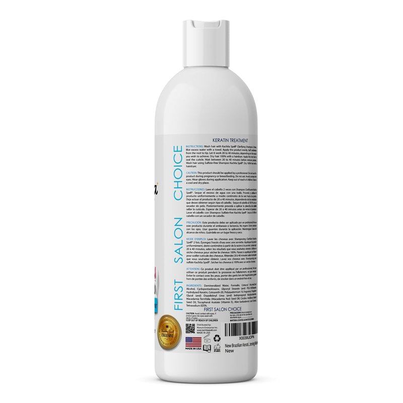 Kit Includes: - 16 oz (500ml) Chocolate Keratin - 16oz (500ml) Clarifying Shampoo. Restores vitality by repairing the hair from the inside out. Wash hair with Kachita Spell Clarifying Shampoo 2 times. Blot excess water with a towel. Apply the product evenly, half centimeter from the root to tip. Let it work 20 to 40 minutes, depending on the results you wish to achieve. Dry hair 100% with a hairdryer. Apply the iron hair to seal the cuticle. Wait between 20 to 40 minutes before remove product. Wash hair using Sulfate-free Shampoo Kachita Spell. Dry 100% hair with a hairdryer.