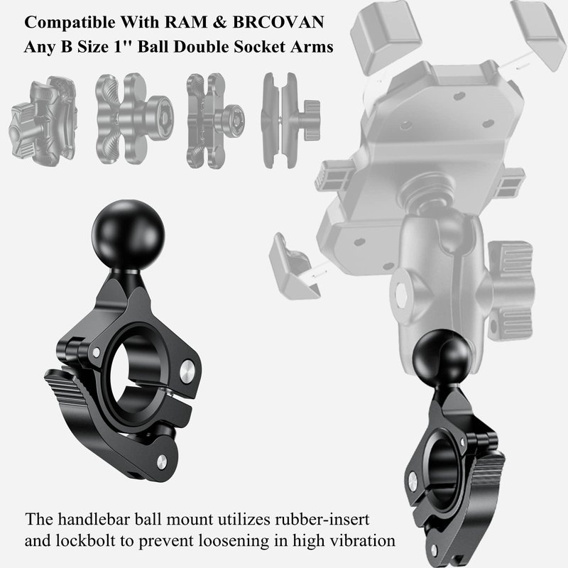 - ▶ This 1 inch ball handlebar mount compatible with RAM Mounts & BRCOVAN any B size 1'' ball double socket arms. Work for other devices with 1 inch swivel ball mounting pattern.