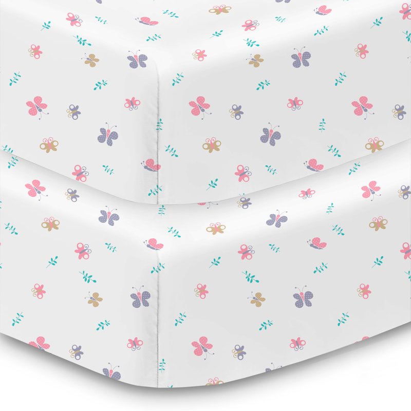 BreathableBaby Cotton Percale Fitted Sheet, for 52" x 28"/132 x 71 cm Crib & Toddler Bed Mattress, Butterflies (2-Pack)
