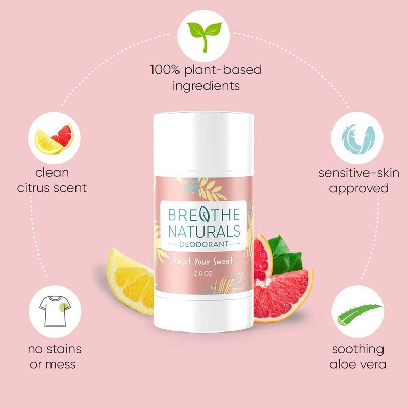 Reset Your Sweat with Breathe Naturals Deodorant! Whether it’s a long workout, run on the beach, or just your average day in the office, Breathe Naturals has you covered! Grapefruit Lemon leaves your underarms with a nice clean citrus scent. Our all-natural and effective formula helps neutralize odor and keeps you smelling fresh all day! We only use ingredients that are actually good for your skin, such as Coconut Oil, Vitamin E, Aloe Vera, Magnesium, Shea Butter, and more! Unlike other natural deodorants that may feel like sand paper or sticky going on, Breathe Naturals glides on smooth and feels like there’s practically nothing there after drying! A little bit goes a long way, only 2-3 swipes needed! We use essential oils because they help to prevent odor, combat inflammation, calm irritation, and soothe sensitive skin. No aluminum and no synthetic fragrance means no yellow pit stains or irritation/ rash. Great for sensitive skin! Breathe Naturals Deodorant also provides antioxidants to your skin to keep it soft and rich; they also help reduce free radicals and prevent clogged pores. All these benefits while leaving you with a refreshing scent, a smooth feel, and a non-toxic solution to smelling great all day! *All products come new and in sealed zip lock packaging.