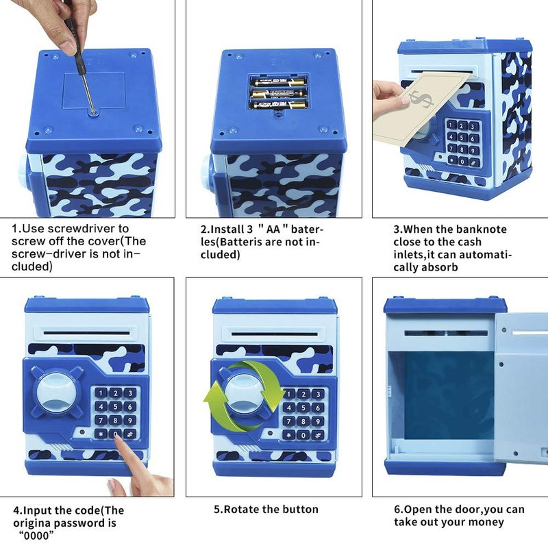 - 【Password protection】The piggy bank has a password-protected lock.The default password is 0000 ,you can change to another 4 digits password. If you Forgot your password, Please remove the battery and reinstall it after 5 minutes. The password will be restored to "0000".