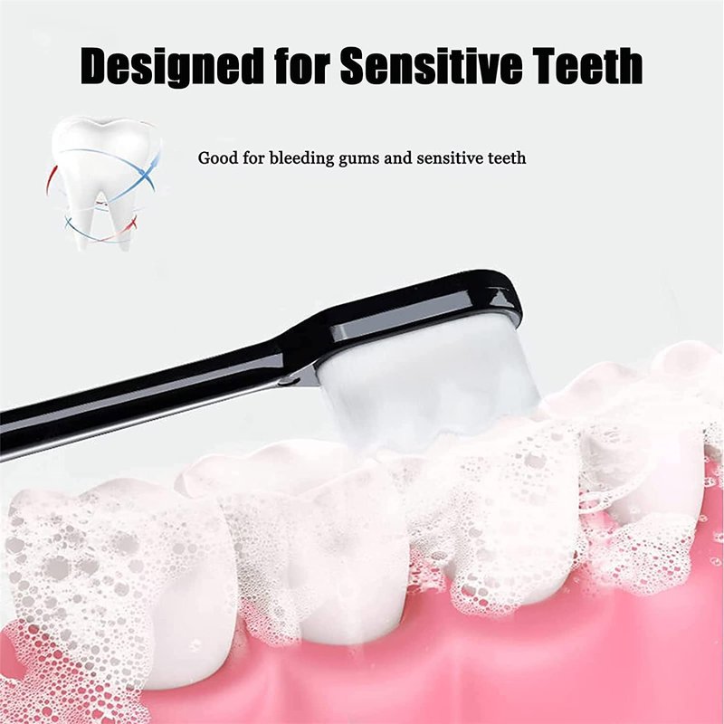 - 【Deep Cleanse】Extra soft toothbrush with more than 20,000 pretty soft micro-nano bristles,the slender brush is soft and flexible, allowing it to penetrate the teeth and sulcus to remove tartar and clean the teeth without damaging the tooth enamel. High-density uniform Soft rubber teeth Wear-resistant and durable Tongue-cleaning With comprehensive cleaning function.