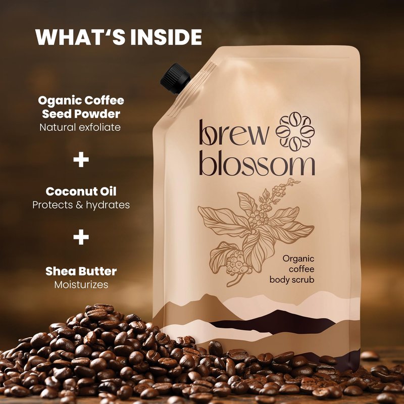 - INGREDIENTS: Organic Coffee Body Scrub by Brew Blossom with the main ingredients - Organic coffee bean powder & Natural oils, help skin smooth & hydrated, bring a feeling of relaxation & refreshment, wipe away the day's stress.