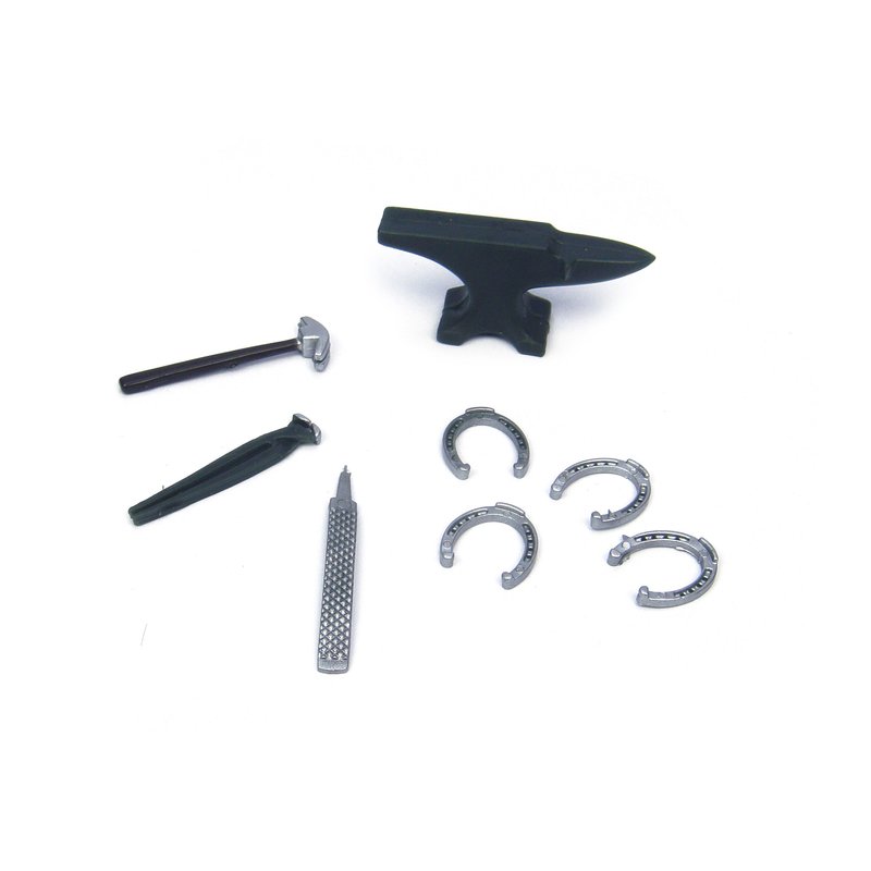 - He comes with everything he needs to shoe a horse: an anvil, hammer, file, nippers, and even a set of horseshoes!
